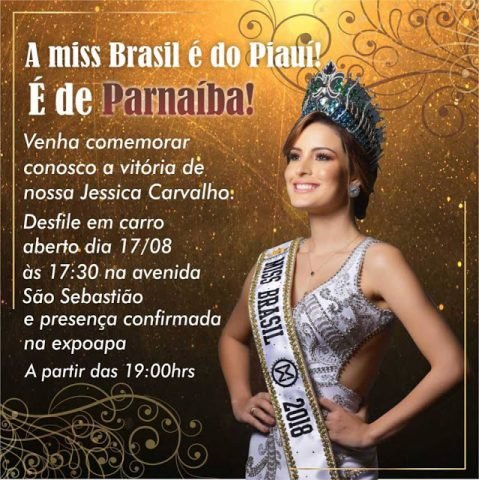 Jéssica Carvalho chega a Parnaíba nesta sexta-feira (17) e desfilará em carro aberto pela Avenida São Sebastião apresentando a coroa de seu reinado como Miss Brasil Mundo, em seguida segue para a Expoapa.